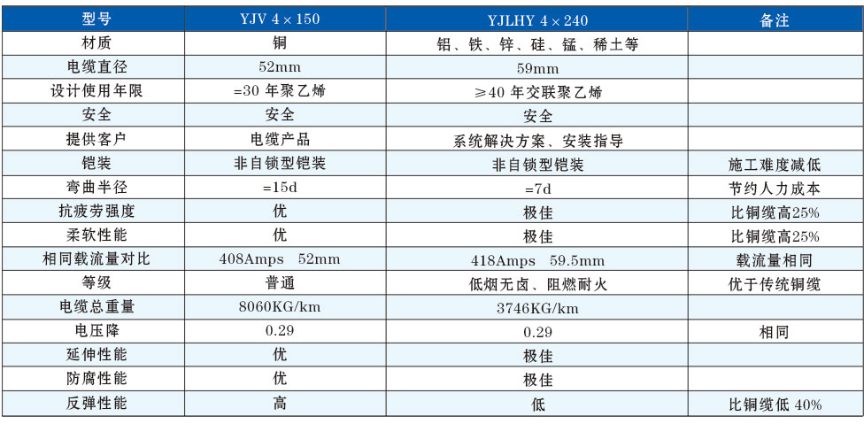 鋁合金芯電力電纜與銅或鋁芯電力電纜性能對比表